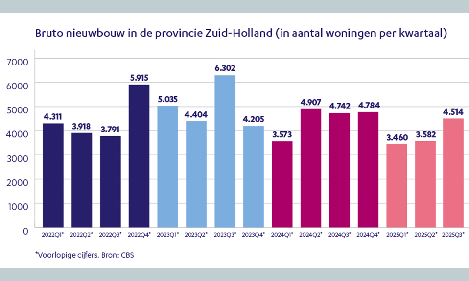 In het derde kwartaal van 2025 zijn er in Zuid-Holland bijna 5.000 nieuwe woningen gerealiseerd. Uit het Kwartaalbericht Woningvoorraadontwikkelingen van de provincie Zuid-Holland blijkt dat er 3.649 nieuwbouwwoningen zijn gebouwd. Daarnaast kwamen er nog eens 1.318 woningen op een andere manier bij, bijvoorbeeld door van kantoren appartementen te maken.