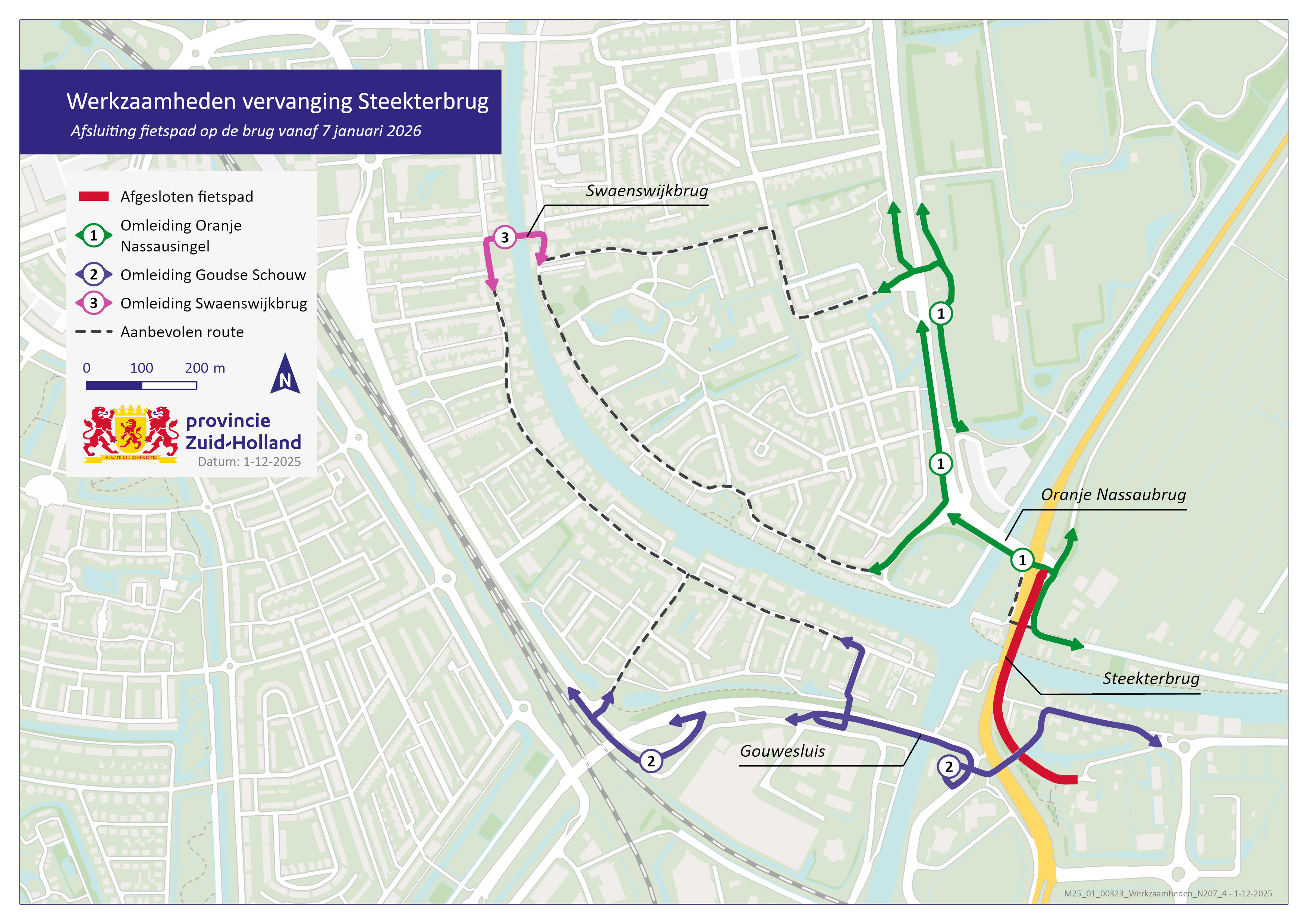 Het fietspad op de brug gaat op 7 januari 2026 dicht. Het fietsverkeer kan dan een andere route volgen. Deze omleidingsroute is maximaal 3 kilometers lang en gaat via de hefbrug Gouwesluis de Swaenswijkbrug in Alphen aan den Rijn. Dat betekent ongeveer 8 minuten omrijdtijd.