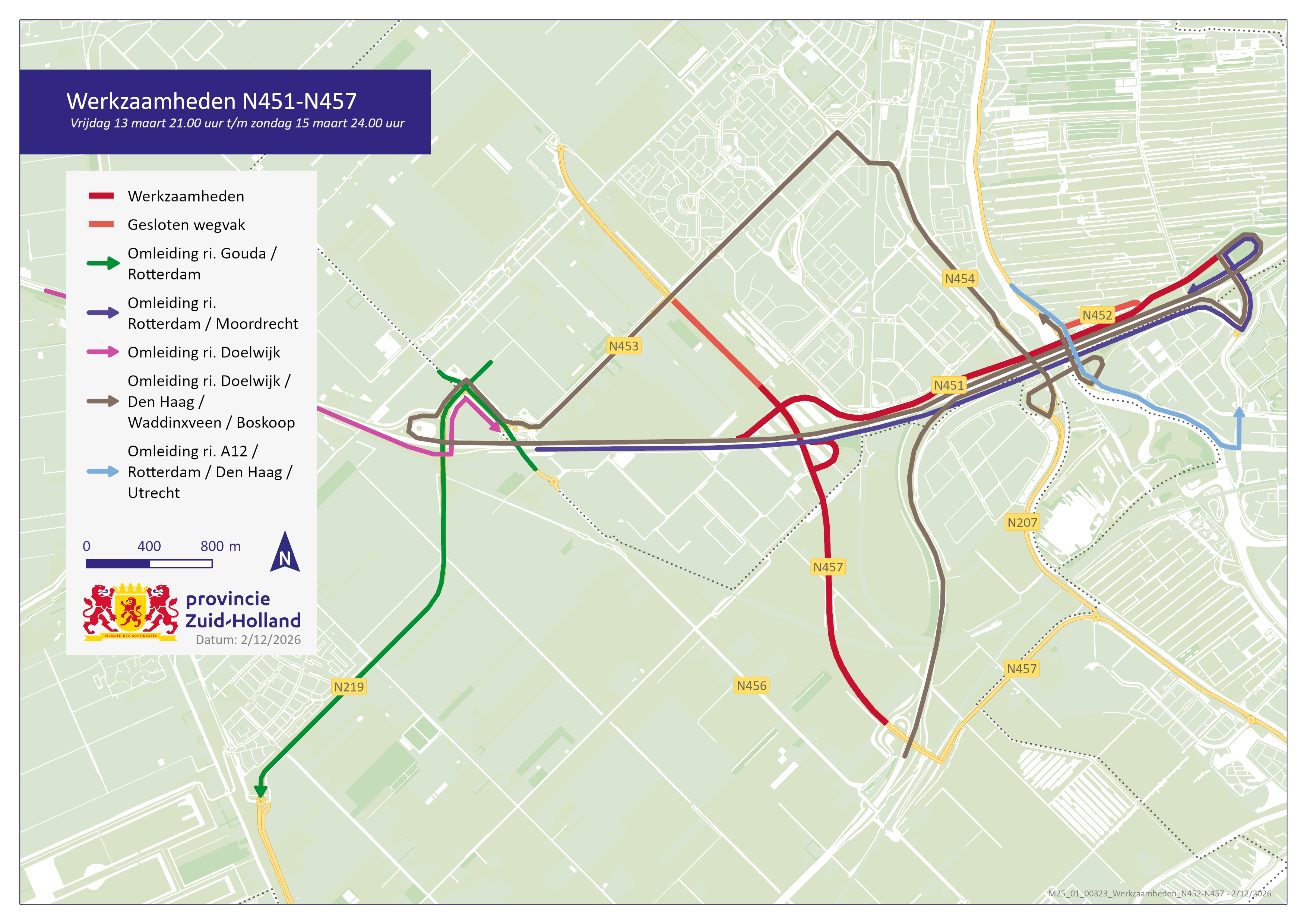 De provincie werkt aan de N451 en N457 van vrijdag 13 maart tot en met zondag 15 maart 2026. De N451, N452 en N457 zijn dan afgesloten. Het verkeer volgt omleidingen.