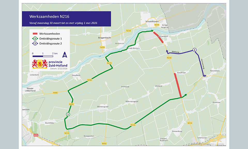 N216: De provincie voert van 30 maart tot en met 1 mei 2026 onderhoud uit aan de N216 bij Goudriaan en bij Nieuwpoort. Tijdens deze werkzaamheden is de weg en het fietspad voor een deel of volledig afgesloten. Het verkeer volgt dan omleidingenwerkzaamheden 30 maart – 1 mei 2026