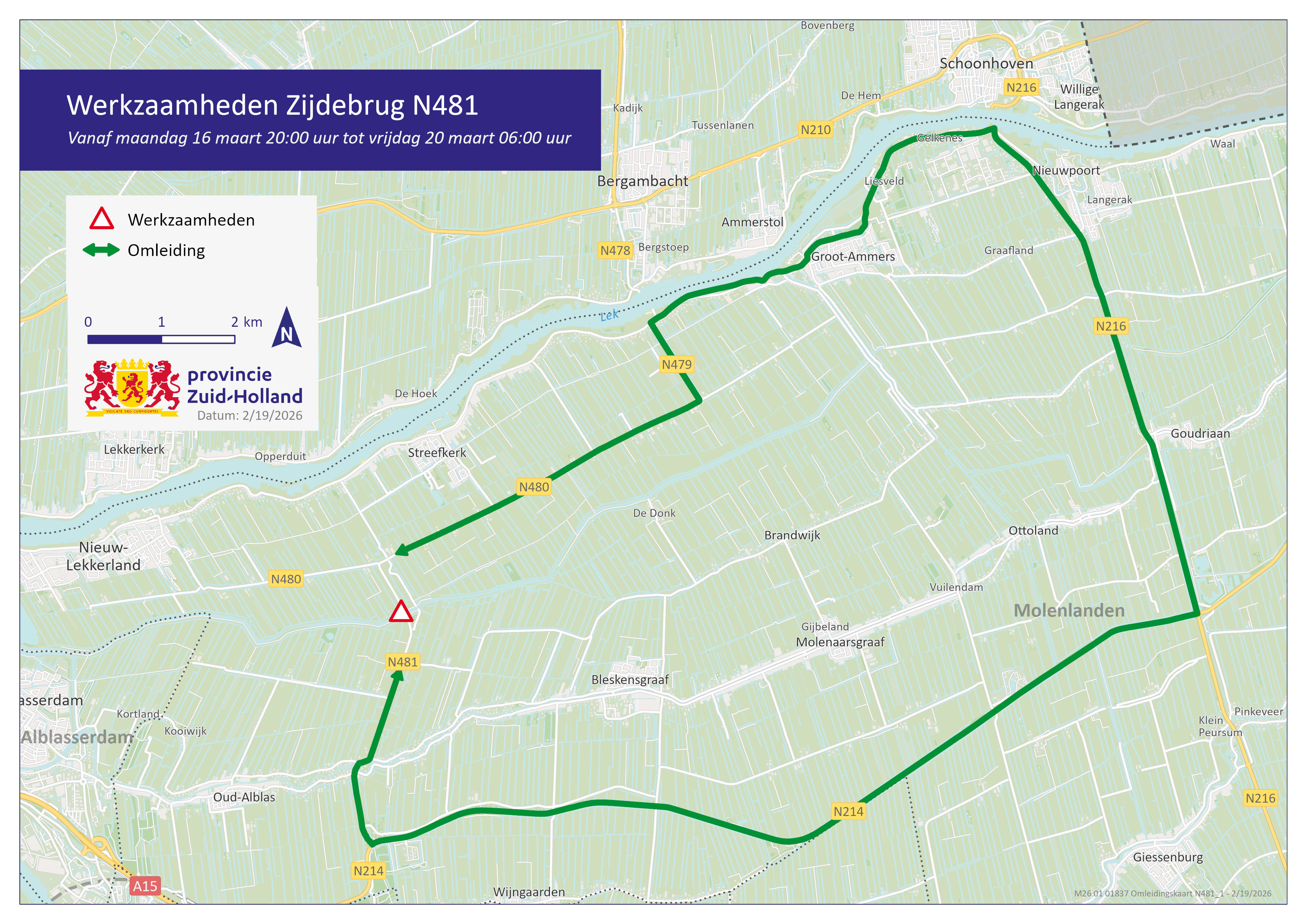 De provincie voert van 16 maart 20:00 uur tot en met 20 maart 06:00 uur 2026 onderhoud uit aan de Zijdebrug (N481). Tijdens de werkzaamheden is de weg tussen de Geerweg en de Middenpolderweg 4 nachten afgesloten. Het verkeer volgt dan omleidingen.