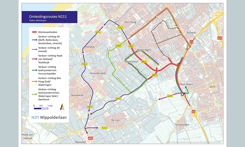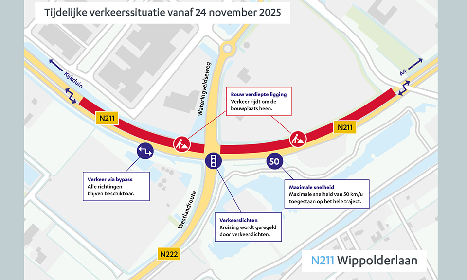 Tijdens de weekenden van vrijdag 14 november 22.00 uur tot maandag 17 november 04.00 uur en van vrijdag 21 november 22.00 uur tot maandag 24 november 04.00 uur is de N211 Wippolderlaan afgesloten tussen de Erasmusweg in Den Haag en de A4. Dit zorgt voor extra drukte op de omliggende wegen.
