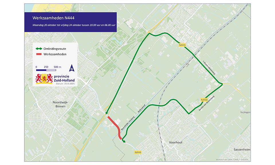 De provincie vernieuwt het asfalt van de N444 bij Noordwijk. De weg is tussen 20 en 24 oktober 2025 in de avond en nacht afgesloten. Er zijn omleidingen.