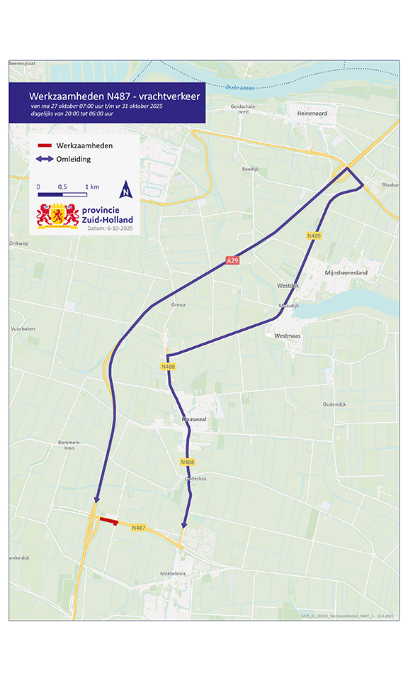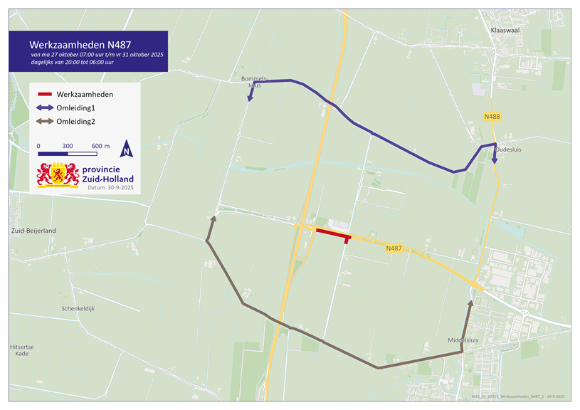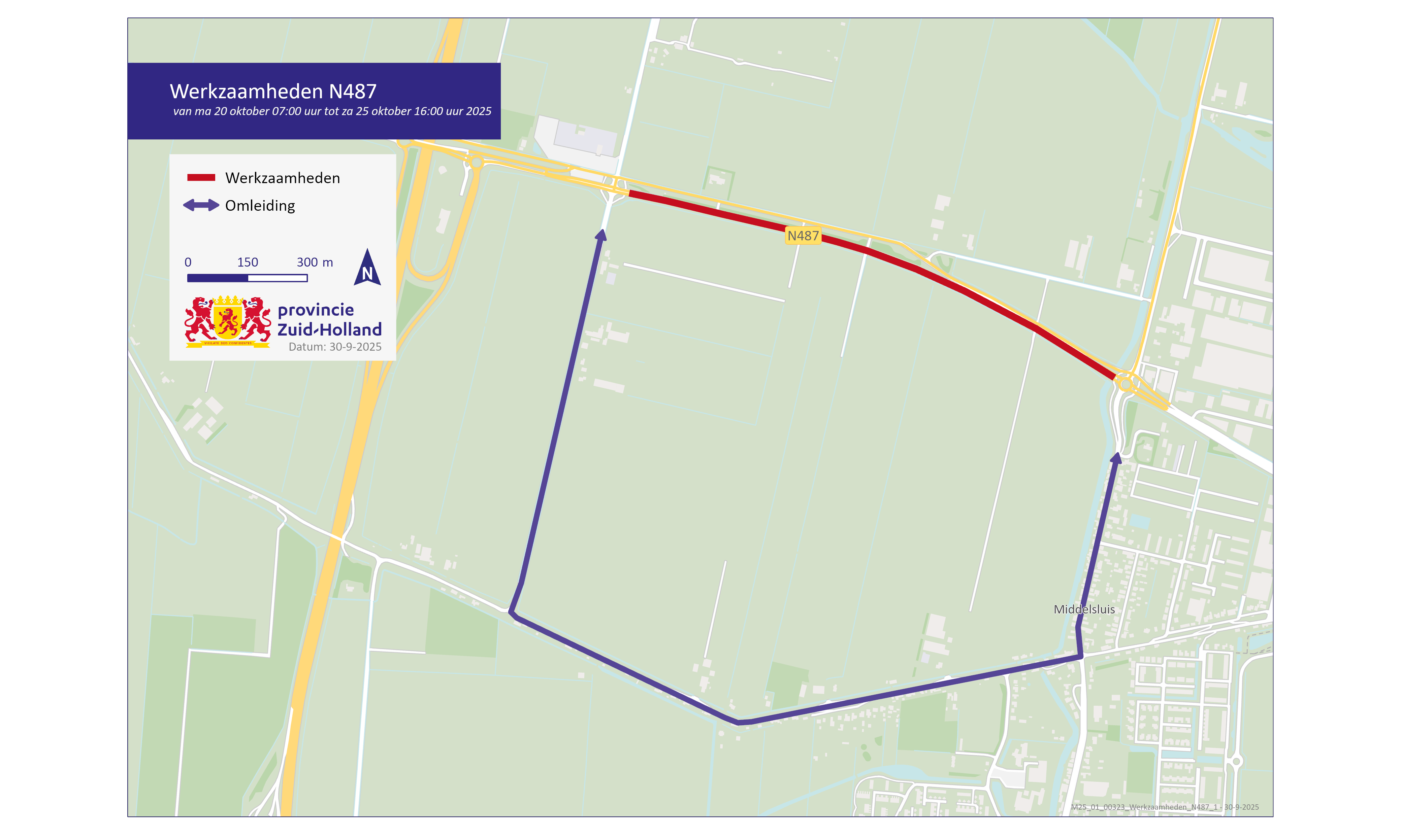 Provincie Zuid-Holland voert van maandag 20 oktober tot en met zaterdag 1 november 2025 onderhoud uit aan de Provincialeweg (N487) bij Numansdorp. Een deel van de weg is dan afgesloten. Het verkeer wordt omgeleid.