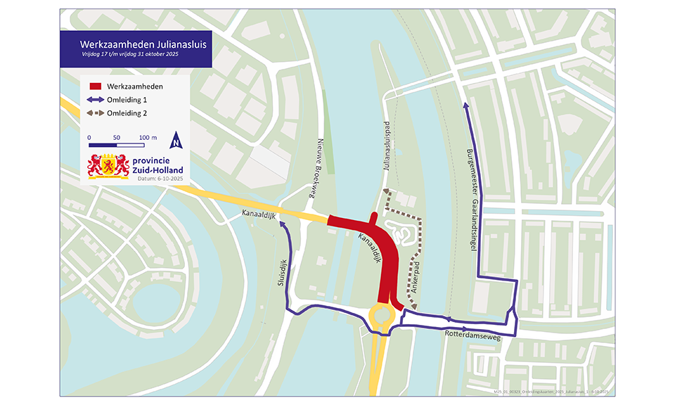 Provincie Zuid-Holland werkt van 17 tot en met 31 oktober 2025 aan het verbeteren van de fietsaansluiting bij de Kanaaldijk (het ankerpad, Julianasluis).
