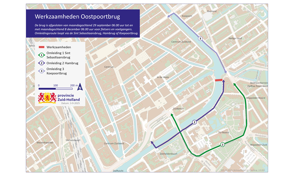 De provincie voert onderhoud uit aan de Oostpoortbrug in Delft van 29 september tot 8 december 2025. Fietsers en voetgangers kunnen gebruikmaken van de omleidingsroutes.
