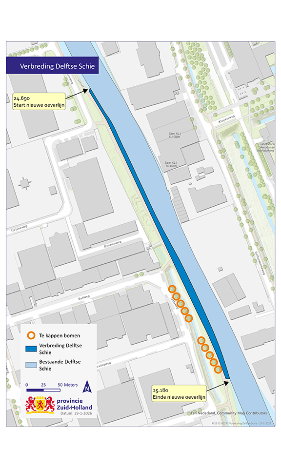 De bomen staan tussen de Teslaweg en de Delftse Schie aan weerszijden van de huidige watergang. Voor het nieuwe fietspad, de tankwal en kabels en leidingen moeten we deze bomen verwijderen. We houden het groenaanzicht zo goed mogelijk in stand. Daar waar we bomen en struiken moeten weghalen, plaatsen we nieuw groen. Dat doen we nadat de werkzaamheden zijn afgerond.