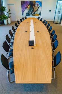 Zuid-Hollandse interieur. De tafel draagt bij aan de groene en duurzame uitstraling van het gebouw als geheel. Het nodigt medewerkers uit om elkaar laagdrempelig te ontmoeten.